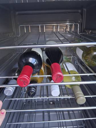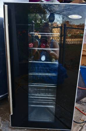 Works as it should, gets cold, black cabinet, glass door, all racks roll easily, contents can be included