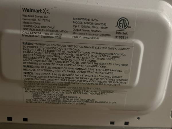 Hi up for sale is a microwave from Walmart. This one is 1-2 years old but still works fantastic! Just getting rid of it cuz I upgraded. Very clean unit!
