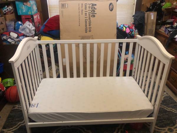 Crib/Toddler bed. Mattress included. Extra parts and hardware included. Toddler bed rail is missing. Good condition. Pick up in Malvern.