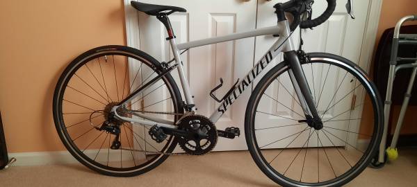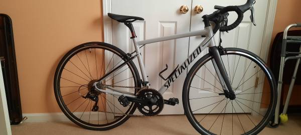 Specialized 2021 Allez E5 Sport road bike WSBC006014063R Dove grey and black 52in Tire 700 x 26c Aluminum alloy frame Shimano 9 speed derailleur and shifters Includes shoes, helmet, light and under...