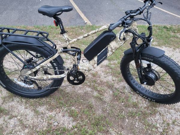 Eunorau defender S hunting bicycle. beast of a bike. dual batteries dual suspension, dual motors. you never have to peddle with this bike if you dont want to. it has select 2wd, rwd or fwd. has upgraded waterproof display with gorilla glass. bike is 2 years old with 175 miles on it. get to your deer stand in silence. text me and I will call you back.