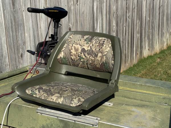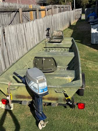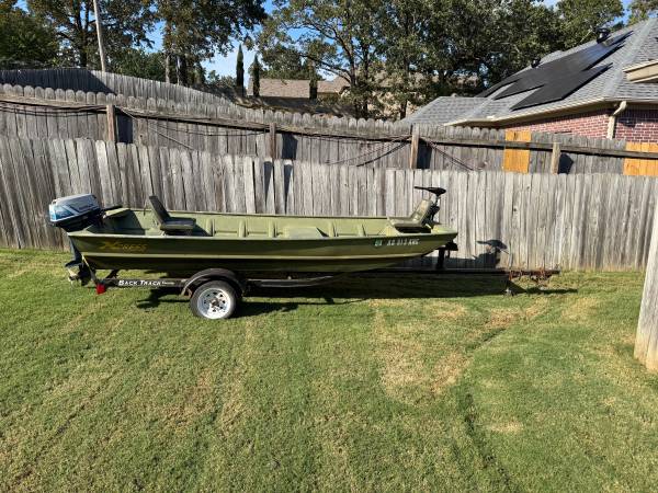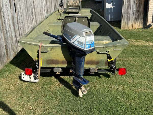 14’ Alumaweld Express Boat with 18hp Nissan motor. Plastic padded swivel seats. Minn Kota 65 trolling motor with deep cycle marine battery. 6 gallon plastic fuel tank. Back track trailer with new...