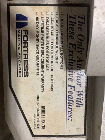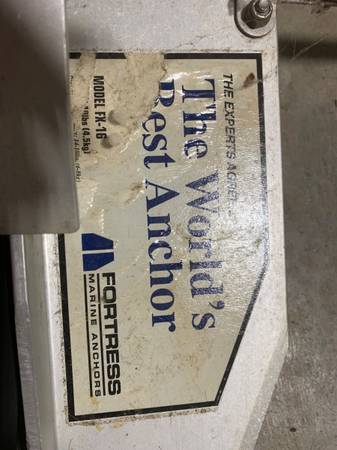For sale brand new Fortress FX-16 anchor. This is a brand new Fortress anchor I purchased but never used. Fortress anchor’s are classified as the World’s best anchor’s. Made in the USA from aluminum magnesium alloy. Recommended boat length 33-38 feet. Weighs 10 pounds.