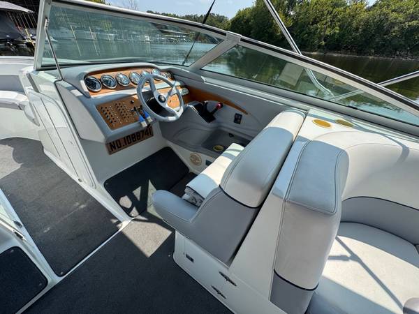 Twin Volvo Penta 5.7L Sterndrive Engines. Paired with Bravo 3 dual-prop drives. Just 845 hours – ready for many more. Freshwater Use Only – Always stored and used in clean water. Snap-In Carpet – Easily removable for cleaning and maintenance. Bimini Top – Provides great shade and comfort during sunny days. Elegant Helm with Burl-Wood Trim – Sophisticated design with excellent visibility. Cockpit Windscreen – Smooth ride with added protection