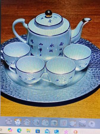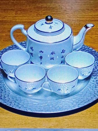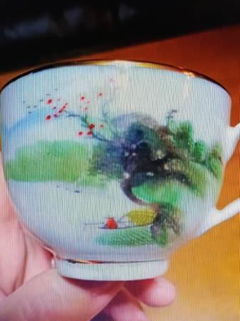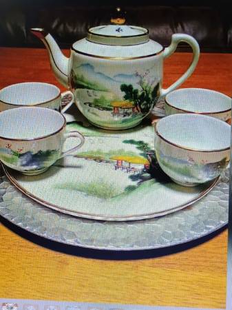 Vintage Hand painted Oriental tea set with tray, gold trimmed and stamped on bottom. It features hand painted, serene fisherman scene on each piece! Would make a great addition to a similar collection. Phone calls only, no texts or emails. show contact info