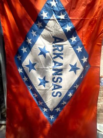 Description: This listing is for a Arkansas State 8' FT x 5' FT LARGE Flag. This amazing state flag measures 96" inches long (8 feet) x 58 inches wide (4.8 Feet). I tried to get the measurements as best I could, but there is no tag showing the measurements, brand name, or type of material. I believe the flag to be made of nylon, but I'm not sure. It is a very strong type of material. There is one 6" long tear at the bottom of the flag at the seam, this is at the bottom end and hardly noticeable. There are some small blemishes on the flag also. The flag when hung is striking and makes a great display. The flag has two ring holes at the end for hanging. Please see images for detail. Contact Leonard. show contact info