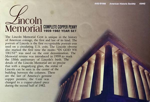 This set of 24 uncirculated pennies includes one from every year during the entire run of pennies produced with the Lincoln Memorial on the reverse side, all made from solid copper. In the last half of 1982 the mint switched over to zinc pennies clad with copper. Now that pennies are history, this will be an interesting collectible, especially in the future. All of them are in beautiful condition. For $25 cash you can take this collection home.
