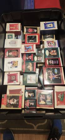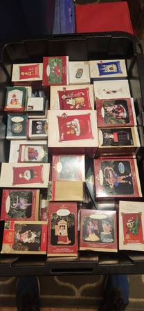 Two full large tote boxes of mostly unopened hallmark ornaments. Make an offer. I have a list of the first tote completed. Approximately 100 per tote. Photos are of me restacking into totes.