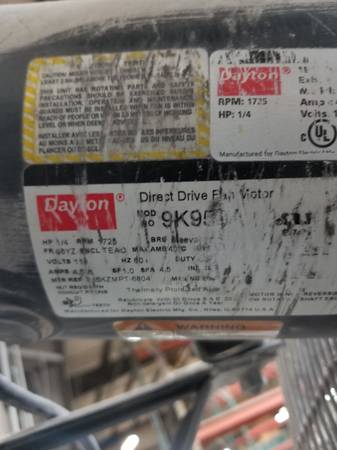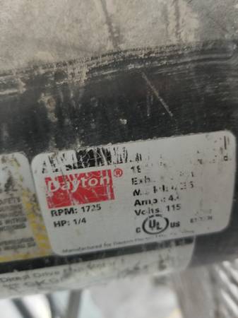 Dayton wall/ceiling mount fan in good condition. Fan model isn't legible in pictures. 18" Industrial Duty Air Circulator; 115V/60Hz/4.4Amp?/1/4HP standard 120V plug Shown mount and hardware...