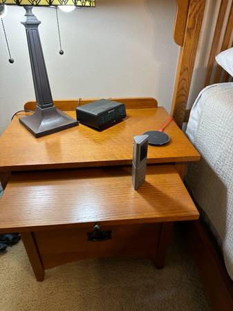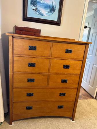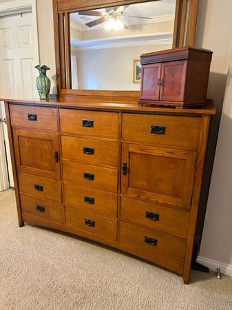 Mission oak style bedroom furniture - King bed w/headboard, footboard & side rails - 2 nightstands - 5-drawer chest - Mule (oversized) 11-drawer dresser w/2 sm cabinets - Mirror Selling for...