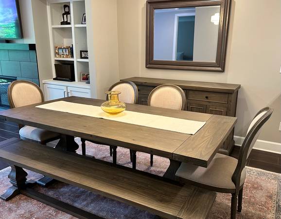 *New Price* Beautiful 7 piece Dining room set with buffet. Great condition - rarely used. Buffet Cabinet, Table, 4 wood-upholstered chairs & Bench - can seat up to 7 Buffet 18”D x 68”W x 36”H...