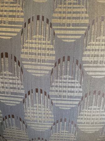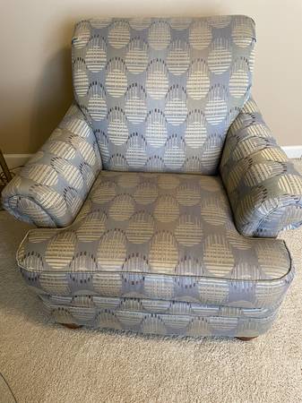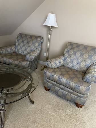Two blue/gray/gold upholstered chairs. They are very heavy duty. The upholstery has some wear from cat scratches on the back/side. Cash Only!
