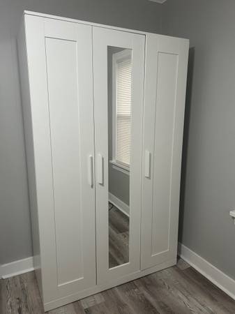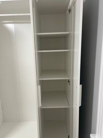 Provides excellent storage with plenty of room for hanging clothes, shelves, or bins. Doors open smoothly and everything is sturdy. Perfect for bedrooms, guest rooms, apartments, or extra storage. $80. I can help you carry out if needed.