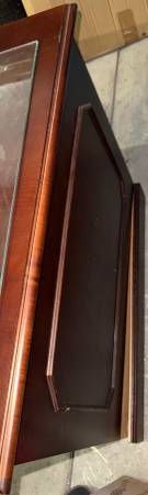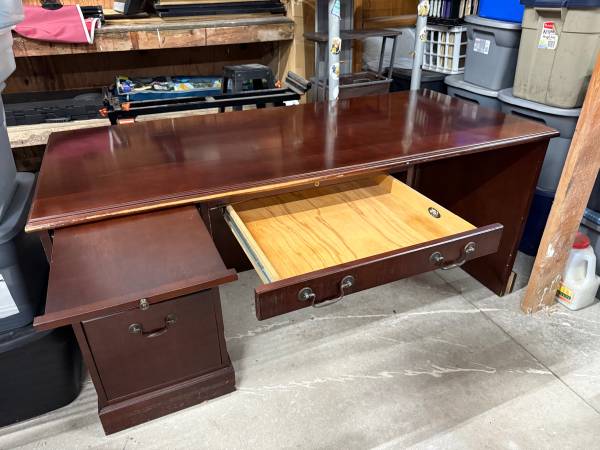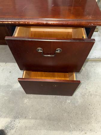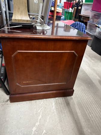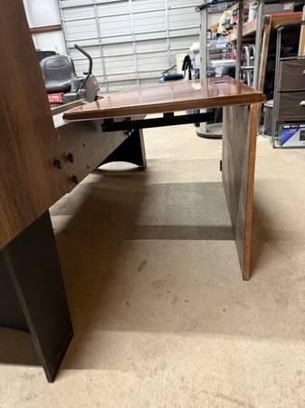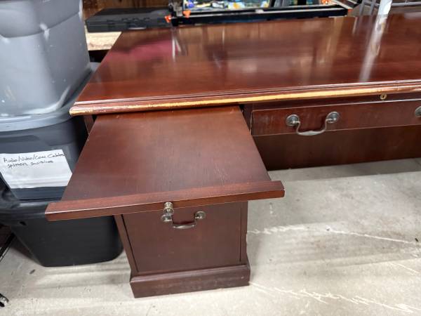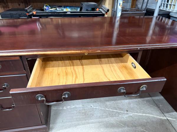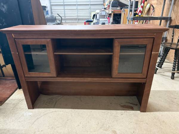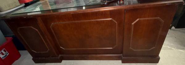 Sectional Executive Desk with hutch and glass top over bridge (center) desktop.When this desk was new, it was priced at $8,000. It’s made from real cherry-oak wood.