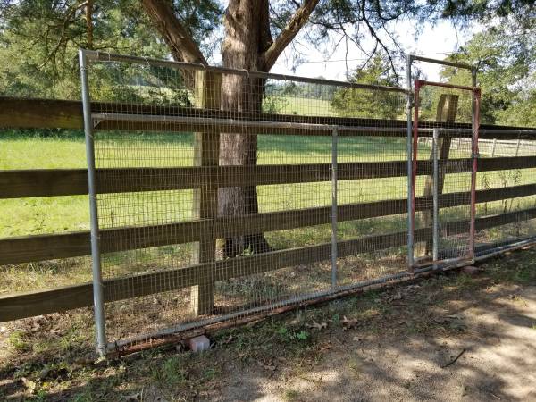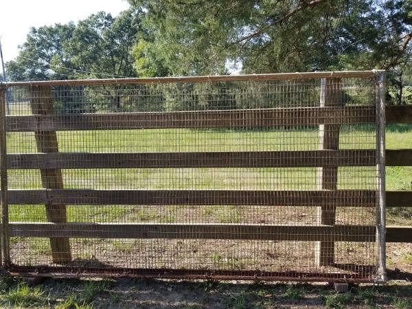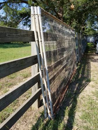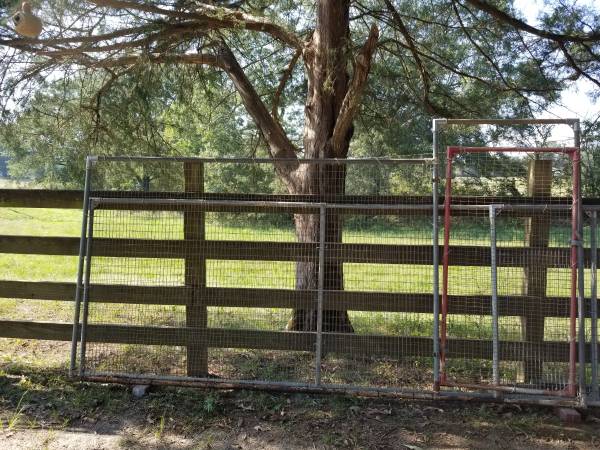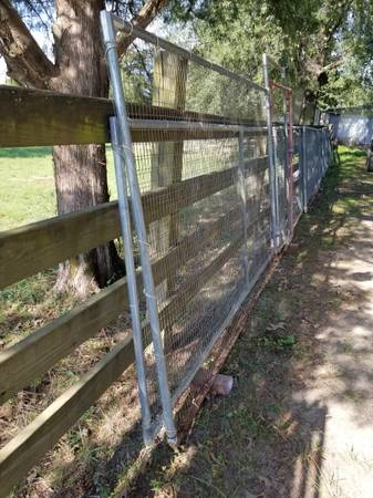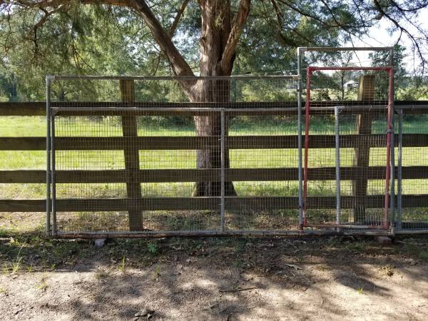 * 1 panel with Door, includes hinges and latch, is 11-feet 2-inches long, the door frame is 6-feet tall, the door is 32-inches wide and 5-feet 2-inches tall = Panel has one damaged corner, rust on bottom pipe, eaten through in spots, still holding.