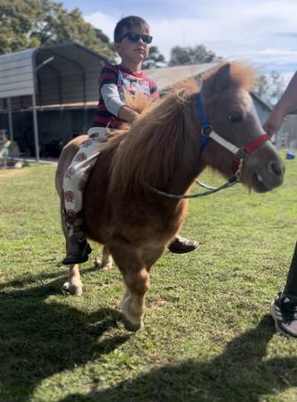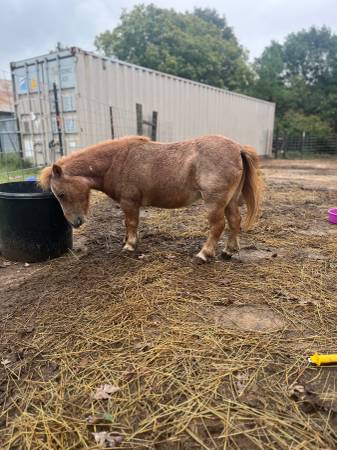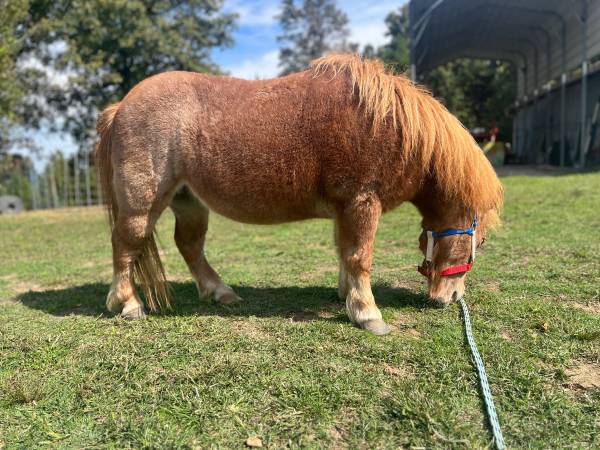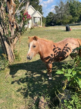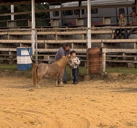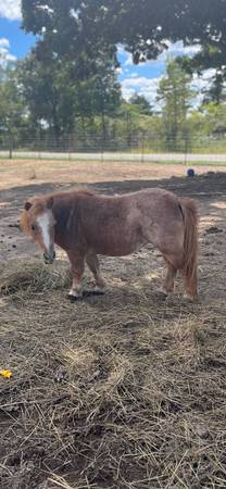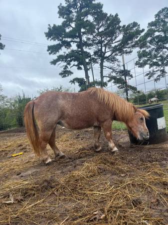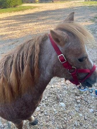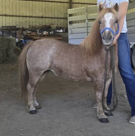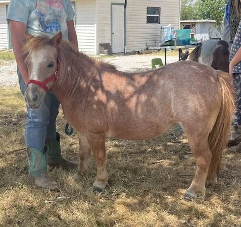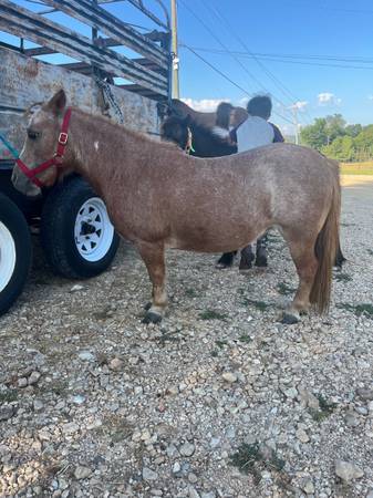 Strawberry shortcake is a miniature pony mare red roan. She is broke to ride lead line, she follows very good. She has a long soft mane and tail. She is the dominant horse in the herd, she acts better when. She is an only horse. The last 2 pictures are of the stud she is bred to.