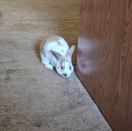 Indoor, litter box trained rabbit. Comes with crate, litter box, feed bowl, water bowl, hay feeder and bed. He is approximately 2 years old and friendly. He enjoys roaming freely in the house.