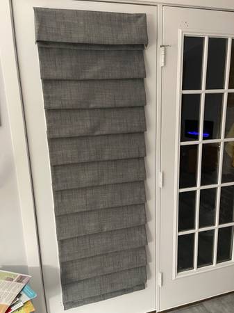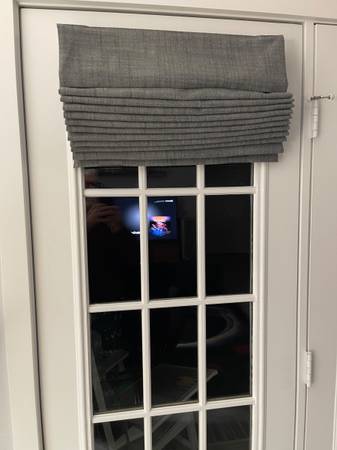 Custom made black-out Roman shades for french doors (outside mount). Each shade measures 22” x 68”. Complete with valance and mounting hardware. They are cordless. From a non-smoking, pet-free home. They are less than a year old and are a dark gray fabric with a white liner. I have replaced my french doors and can no longer use them. They were $475 new from Blinds.com. Price is for a set of 2 shades.
