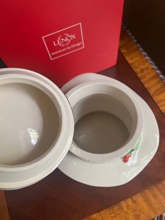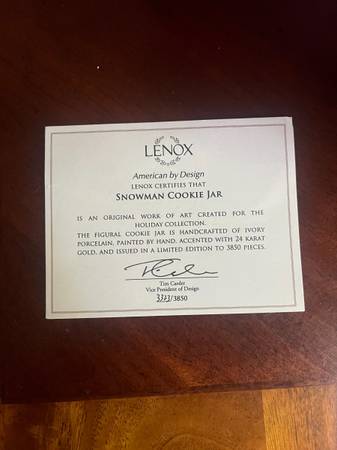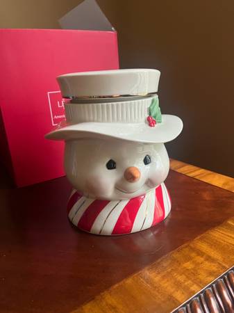 Ceramic Lenox cookie jar in the shape of a cute Christmas Snowman! The top of his hat comes off to reveal the cookies inside. Can also store other delicious treats for a party! A cute vintage touch...