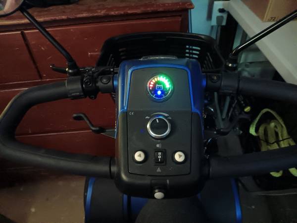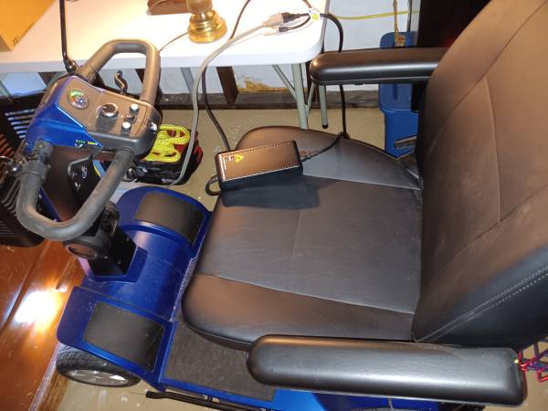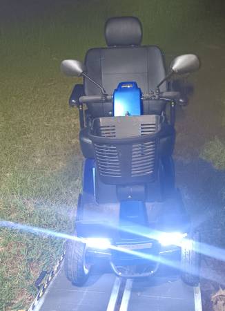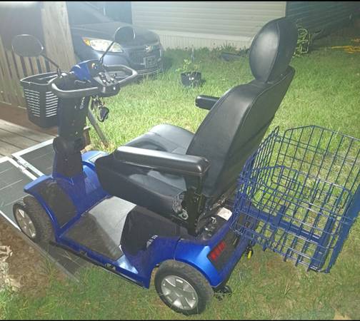 Pride 4 wheel Heavy duty mobility scooter. Comes with two batteries and a charger. New condition, led headlights and taillights, turn signals, rear view mirrors, horn, wide comfortable seat with arm rests, headrest and seat belt. Adjustable speed from turtle to rabbit. Front basket, and Extra shopping basket on the back. 500lb. Capacity. Metallic blue, Everything Works as it should. Only used a few hours.