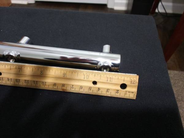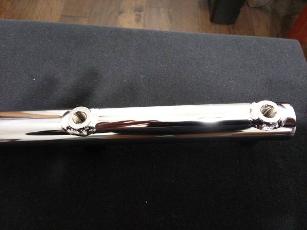 Brand New, American made by Khrome Werks with triple plate chrome this Front Support Tube and/or mount is an OEM replacement for Harley Davidson part number 65492-91. It fits the Fat Boy model from 1991 – 1994 and the Heritage Special Nostalgia model from 1993 – 1995. Both models have the over/under Shotgun style of exhaust system so if that is what you’re looking for this is the correct mount. The length is 11 ¼ inch and the space between threaded mount holes is 4 ½ inches. Please Double check fitment for your application before purchase. Thanks for your interest and Ride Often.