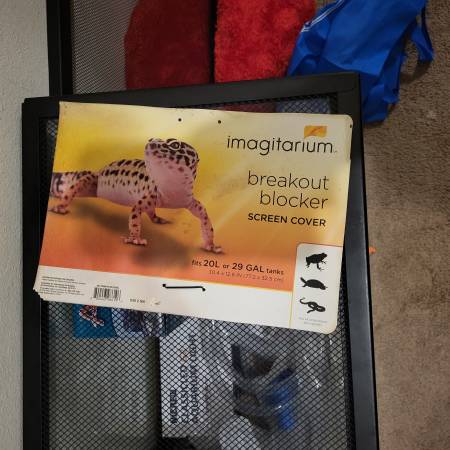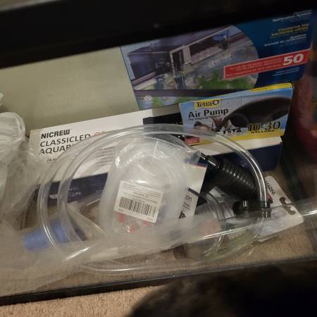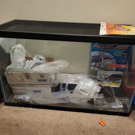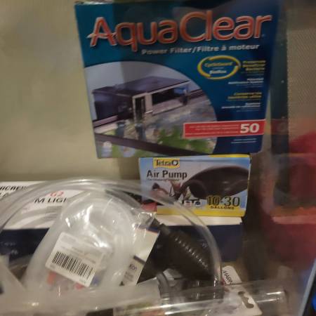 Tank, rocks, hide, air filter cleaning tubes and filter. $130. All new stuff kept in a garage so some stuff need to be cleaned!