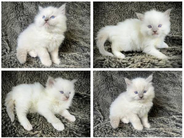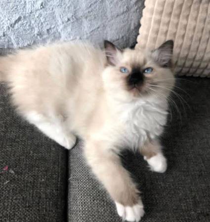 Ragdoll kittens looking to be adopted soon ready to go to their new home. They are 8 weeks old and have the first shots., Rehoming fee. For more information call or text