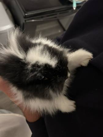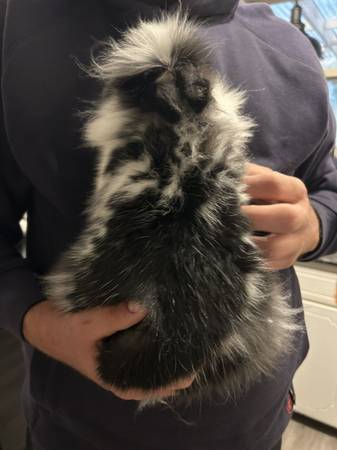 Black and white Lion head rabbit, male, almost a year old, not neutered, friendly and litter box trained. Includes supplies (panel pen, toys, bed, bedding, food, treats, grooming supplies, pet carrier, leash and collar, brand new bag of hay, hay feeder, hideout.) Rehoming fee of $20.