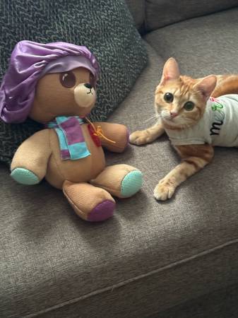 She’s a year old. Current on all shots and spayed. Very friendly and chill. Shes good with kids and dogs. Small rehoming fee