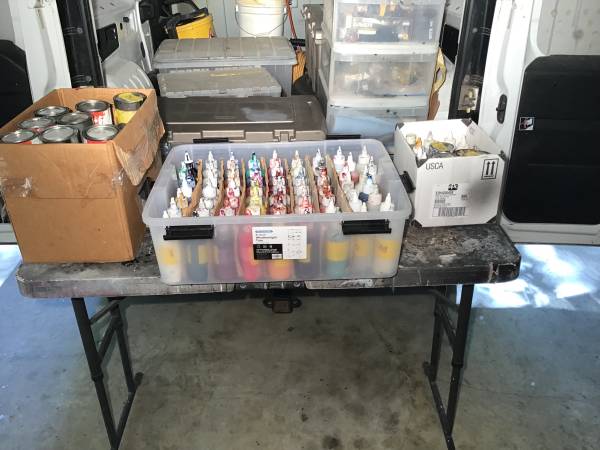 Full set of colors for most all car finishes in 8 oz bottles and cans (60+). Formula support for precise color match. Training is available.