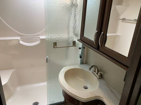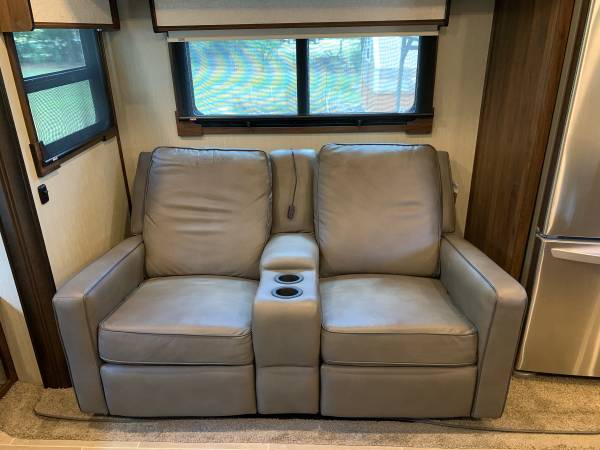 Gently used. Average 3 weeks per year. Non smokers, no pets or children. 20 cu. ft. LG stainless steel refrigerator with ice maker. Voyager package. Outside kitchen never used. Sleeper sofa never slept in. 50” LG tv. 3 slides. 2 air conditioners. New tires. Outside kitchen with refrigerator, microwave and cooktop none of which have been used, Fireplace that also has a heater, Heated tanks.