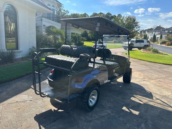 EZ GO Express L6 6 seat golf cart, new lithium ion battery with five year warranty Black diamond stitching on seats with premium vinyl AM/FM/Bluetooth receiver Rockford Fosgate speakers LED light...