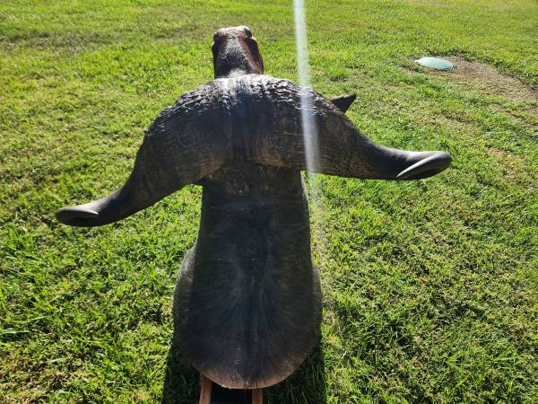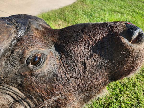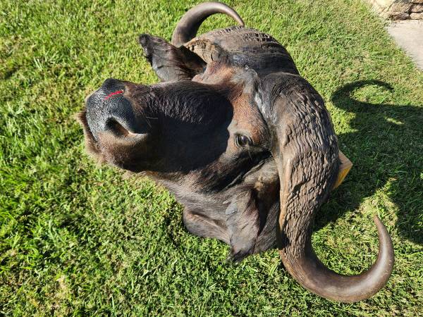 Trophy cape buffalo, 46" wide, fully closed boss, nice drops. Mount is in good shape, nose has a hairline crack, not visible once on the wall. Big old bull.