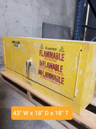 Justrite model 25801 flammable liquid storage cabinet Capacity: 12 gallons External Size: 43" wide x 18" deep x 18" tall Pallet/stand included, if needed. Price listed is for item(s) stated. Items...